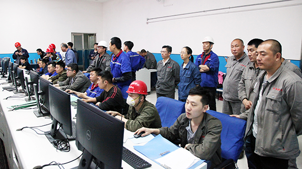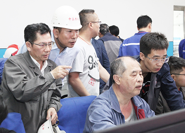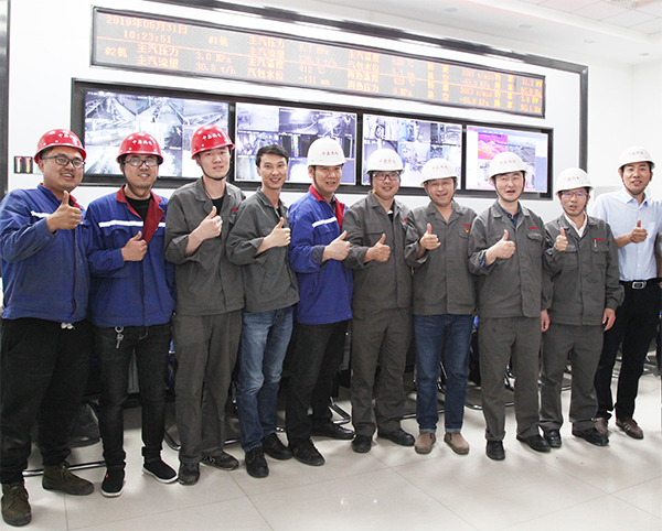 4万机组一次并网成功后,集团总工程师李成玉(右三)、项目建设部长胡林桂(右一)中鑫热电总经理韦毅民(右二)和副总经理李树彬(右四)同部分生产、技术管理骨干在中控室露出欢快的笑容!